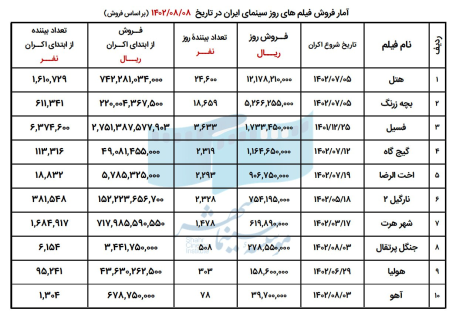 آمار فروش فیلمهای در حال اکران در هشتم آبان