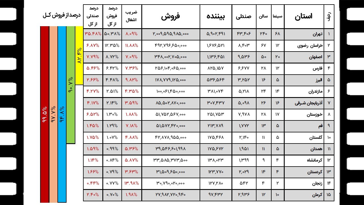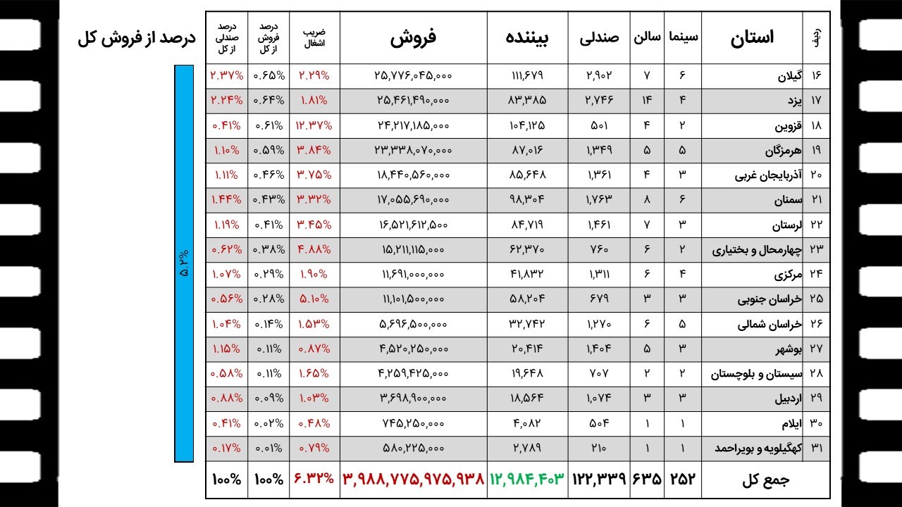 استان اصفهان در رتبه سوم با 000/705/002/348ریال فروش و 451/136/1 بیننده و 20 سینما و 50 سالن و 09/7 درصد ضریب اشغال و 72/8 درصد فروش و استان فارس هم با 000/065/104/256 فروش کل و 157/825 بیننده و 12 سینما و 28 سالن ضریب اشغال 36/7 درصد و با 42/6 درصد فروش و استان البرز با 000/125/779/178 ریال فروش و 564/536 نفر مخاطب و 5 سینما و 16 سالن ضریب اشغال 82/9درصدی و فروش 48/4 درصد از کل را به نام خود ثبت نمودند.