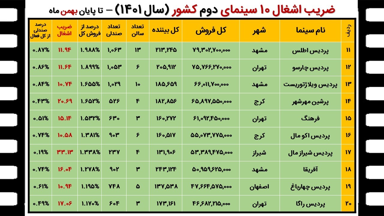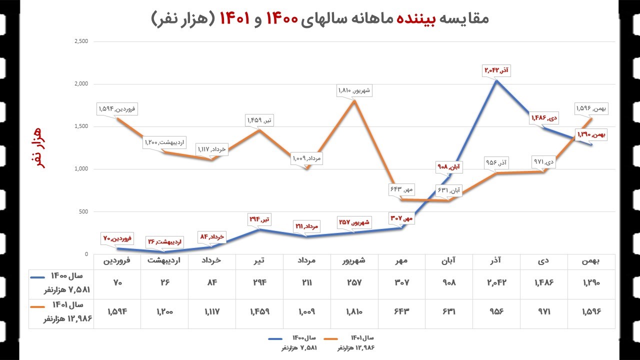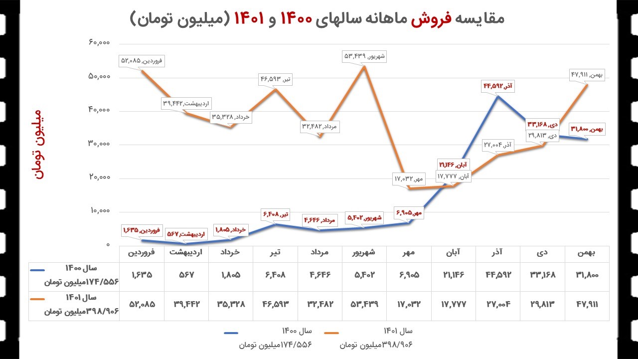 فروش سینمای ایران در سال 1401 در مقایسه با سال گذشته دو نیم برابر افزایش داشته استبخش بعدی گزارش مدیرعامل موسسه مقایسه فروش سالنهای سینما در سال 1400 و 1401 بود که طبق آمار استخراج شده از سامانه سمفا کل فروش در سال 1400 بالغ بر 368/391/556/745/1ریال با 939/581/7 مخاطب و در سال 1401 ، 938/975/775/988/3 ریال با 403/984/12 مخاطب تا پایان بهمن ماه بوده است.