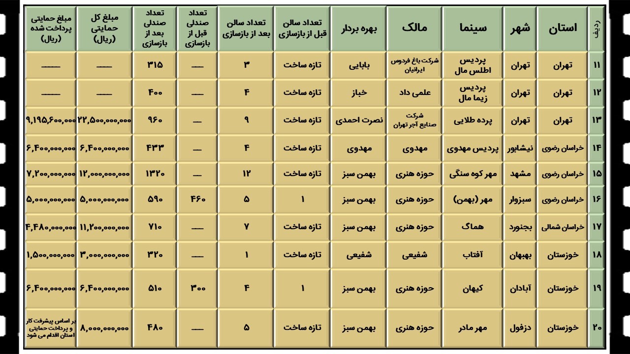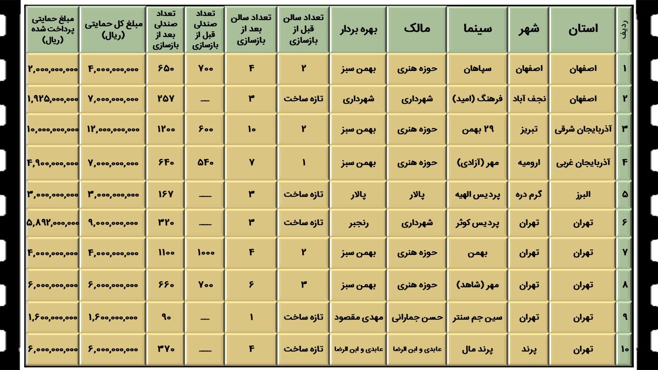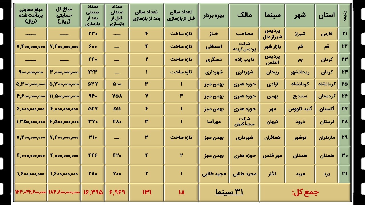 18 استان ، 51 سینما و بیش از 25 میلیار تومان تفاهم استانیرئیس هیئت مدیره موسسه سینما شهر با اشاره به این مطلب که در سال جاری طی سفرهای استانی ریاست محترم سازمان سینمایی کشور و مدیران و معاونین ذی ربط تا به حال 18 استان مورد حمایت و عقد تفاهم نامه همکاری قرار گفته اند گفت؛ 51 سینما در استانهای آذربایجان شرقی؛ ایلام؛ اردبیل؛ بوشهر؛ زنجان؛ سیستان و بلوچستان؛ کردستان ، کرمان؛ کرمانشاه، کهگیلویه و بویراحمد، گلستان؛ جنوب کرمان؛ چهارمحال و بختیاری؛ خراسان شمالی ؛ خراسان رضوی ؛ قم، لرستان و همدان با 33 شهر و شهرستان مورد حمایت و عقد قرارداد قرار گفته اند گفت؛ مبلغ 000/000/556/253 ریال تفاهم شده است.