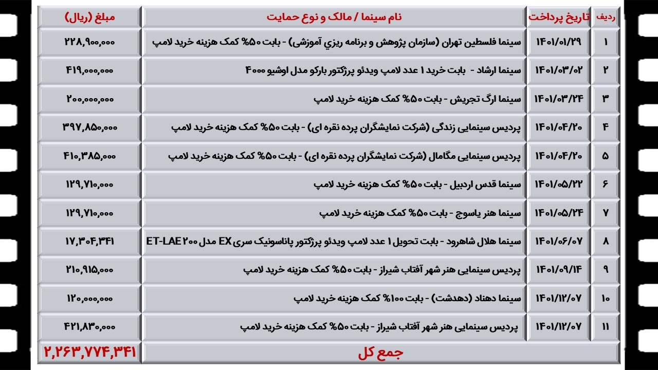 وی با اشاره به اینکه یکی از تجهیزات مهم مصرفی در سالن ها، لامپهای پروژکتور می باشد گفت: در این بخش نیز تعدادی از سینماها حمایت شده اند.