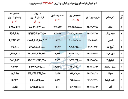 جدول فروش 10 فیلم اول در حال اکران در نهم آبان اعلام شد