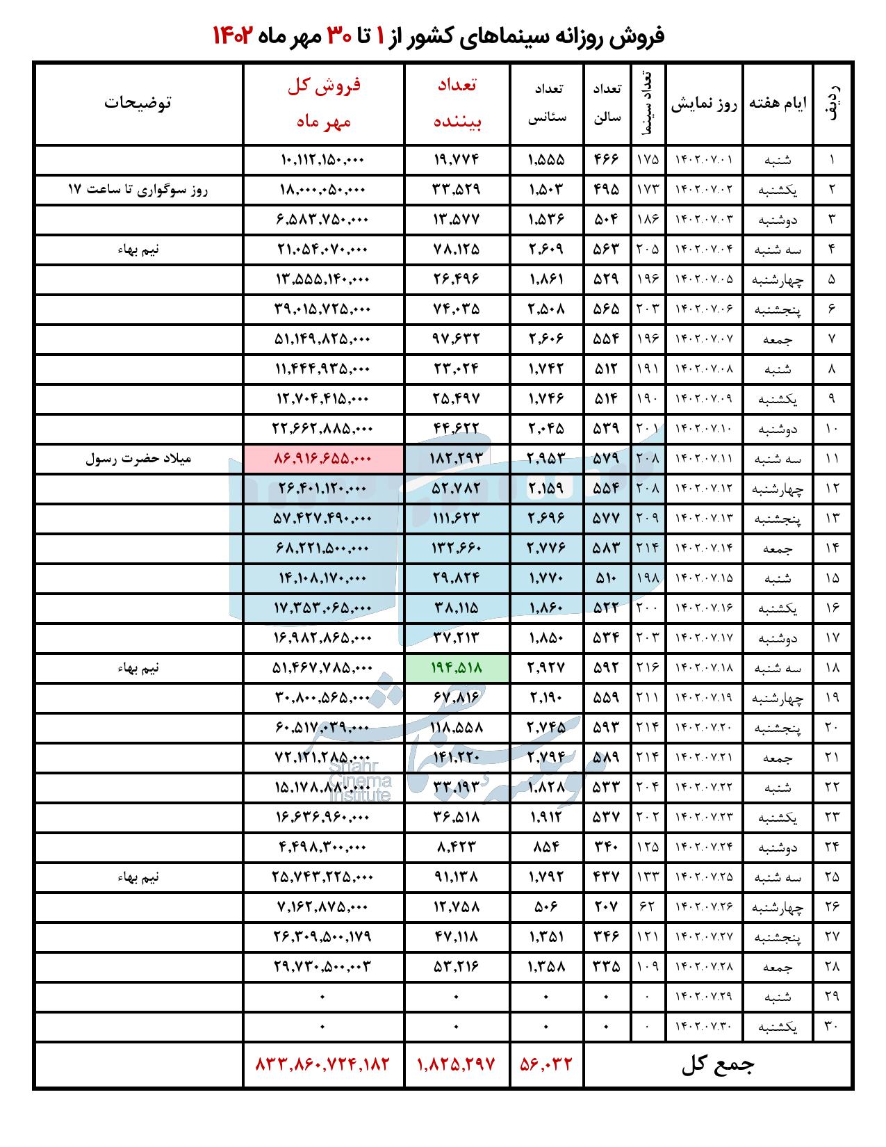 آمار مهر ماه سینماهای کشور بر اساس فروش روزانه و تعداد بیننده اعلام شد.