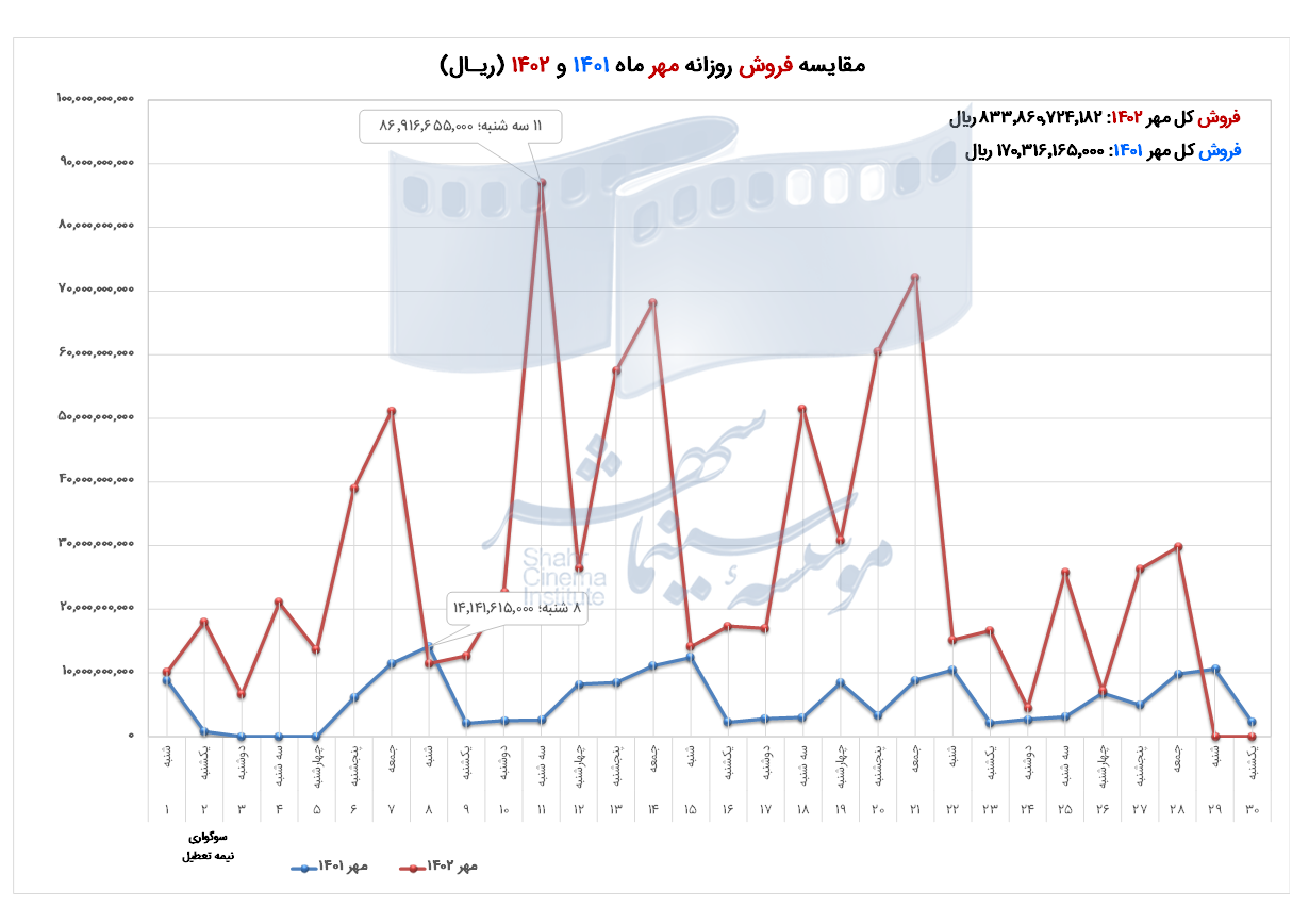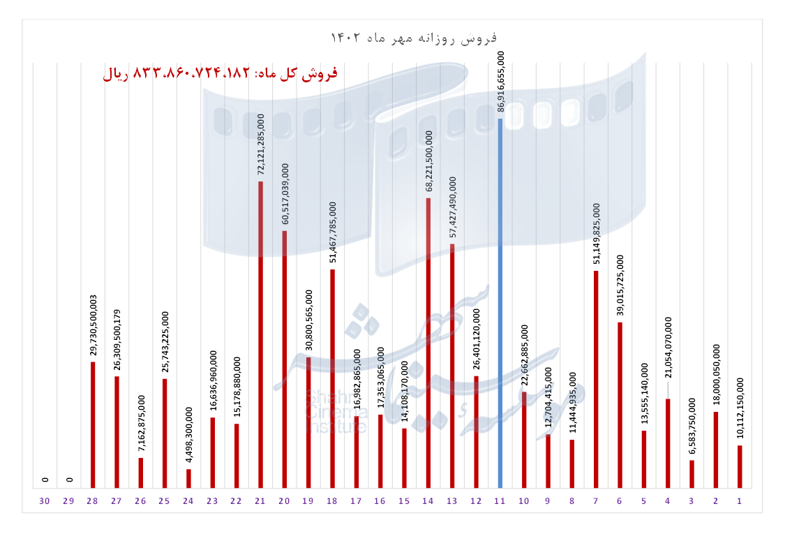 به گزارش روابط عمومی موسسه سینماشهر، آمار فروش سینماهای کشور در مهر ماه بر اساس فروش روزانه 883میلیارد 860 میلیون و 724 هزار ریال بوده است که نسبت به ماه گذشته 290 میلیارد و 180 میلیون و 949 هزار ریال افزایش داشته است. همچنین این رقم نسبت به سال گذشته، همین ماه 663 میلیارد و 544 میلیون و 559 هزار ریال افزایش داشته است.