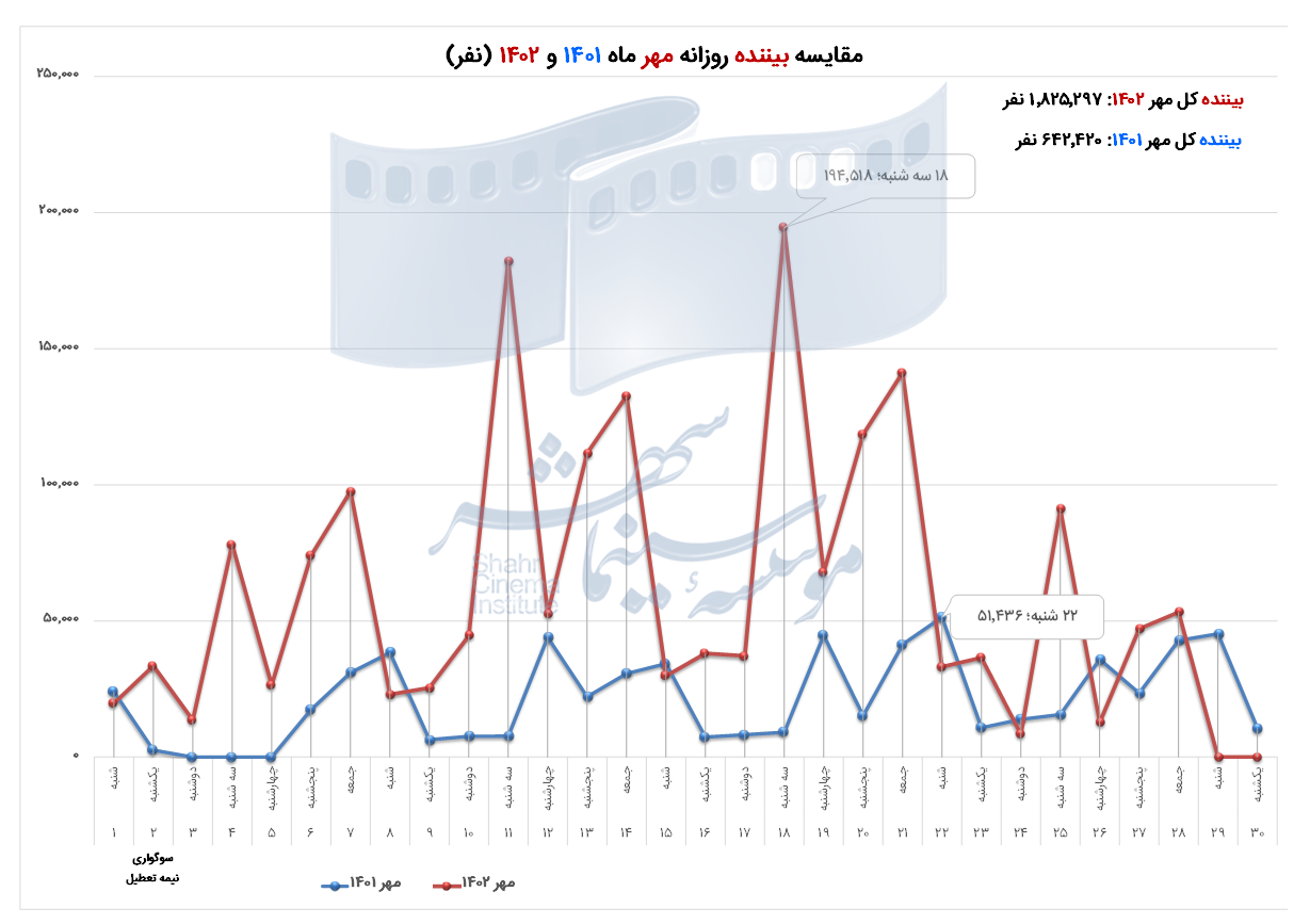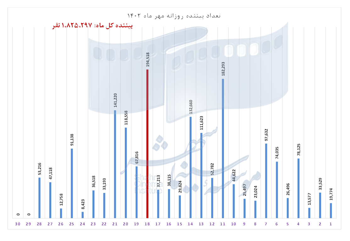 بر اساس این گزارش، تعداد کل بیننده در سینماهای سراسر کشور نیز یک میلیون و 825 هزار و 297 نفر اعلام شد که روزهای سهشنبه، هجدهم مهر ماه، با 194 هزار و 518 نفر و سهشنبه 11 مهر با 182 هزار 293 نفر به ترتیب بیشترین آمار مخاطب را در این ماه داشتند.
