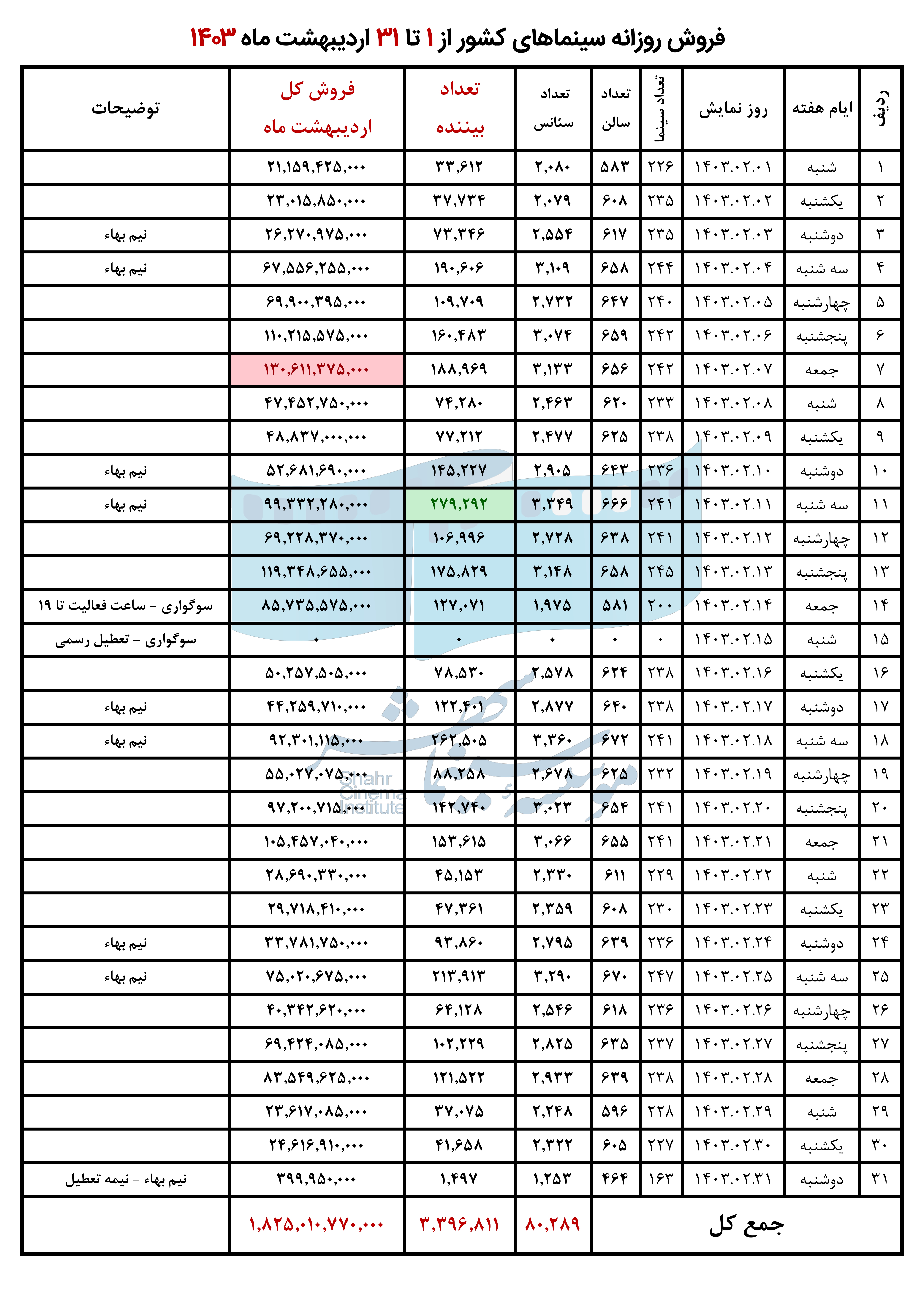 فروش سینمای ایران در اردیبهشت 1403 اعلام شد