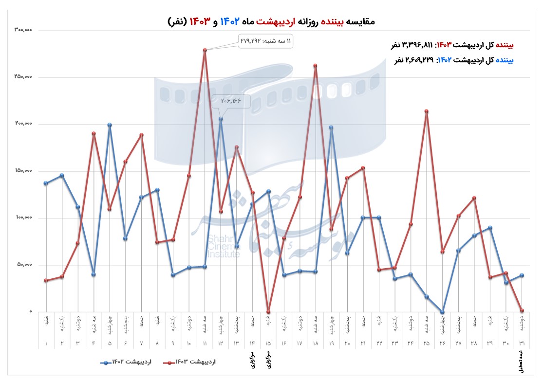 به گزارش روابط عمومی موسسه سینماشهر، جمعه هفتم اردیبهشت با فروش بیش از 13 میلیارد و 61 میلیون تومان، پرفروشترین روز و سهشنبه 11 اردیبهشت با 279 هزار و 292 نفر پرمخاطبترین روز از اردیبهشت ماه محسوب میشوند.