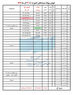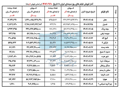 فیلمهای «هتل» با فروش بیش از 26 میلیارد و 700 میلیون تومان در 10 روز اول ماه آذر به مجموع فروش 164 میلیارد تومان، «فسیل» با فروش بیش از 5 میلیارد و 900 میلیون تومان در 10 روز اول ماه آذر به مجموع فروش بیش از 291 میلیارد تومان، «بچه زرنگ» با فروش بیش از 5 میلیارد و 700 میلیون تومان در 10 روز اول ماه آذر به مجموع فروش بیش از 44 میلیارد تومان، «جوجه تیغی» با فروش بیش از 3 میلیارد و 800 میلیون تومان در 10 روز اول ماه آذر به مجموع فروش بیش از 5 میلیارد و 700 میلیون تومان، «گیجگاه» با فروش بیش از 2 میلیارد و 100 میلیون تومان در 10 روز اول ماه آذر به مجموع فروش بیش از 13 میلیارد و 200 میلیون تومان، «نارگیل2» با فروش بیش از یک میلیارد و 800 میلیون تومان در 10 روز اول ماه آذر به مجموع فروش بیش از 20 میلیارد و 900 میلیون تومان، «عامهپسند» با فروش بیش از یک میلیارد و 700 میلیون تومان در 10 روز اول ماه آذر به مجموع فروش 4 میلیارد و 200 میلیون تومان، «حدود 8 صبح» با فروش بیش از یک میلیارد و 700 میلیون تومان در 10 روز اول ماه آذر به مجموع فروش بیش از 3 میلیارد و 400 میلیون تومان، «شهر هرت» با فروش بیش از یک میلیارد و 100 میلیون تومان در 10 روز اول ماه آذر به مجموع فروش بیش از 76 میلیارد تومان و «سرهنگ ثریا» با فروش بیش از 488 میلیون تومان در 10 روز اول ماه آذر به مجموع فروش بیش از یک میلیارد و 400 میلیون تومان دست پیدا کردند.
