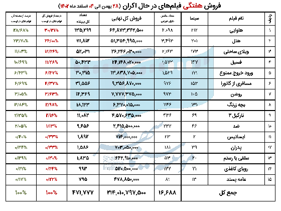 فروش سینمای ایران در هفته اول اسفند ماه اعلام شد